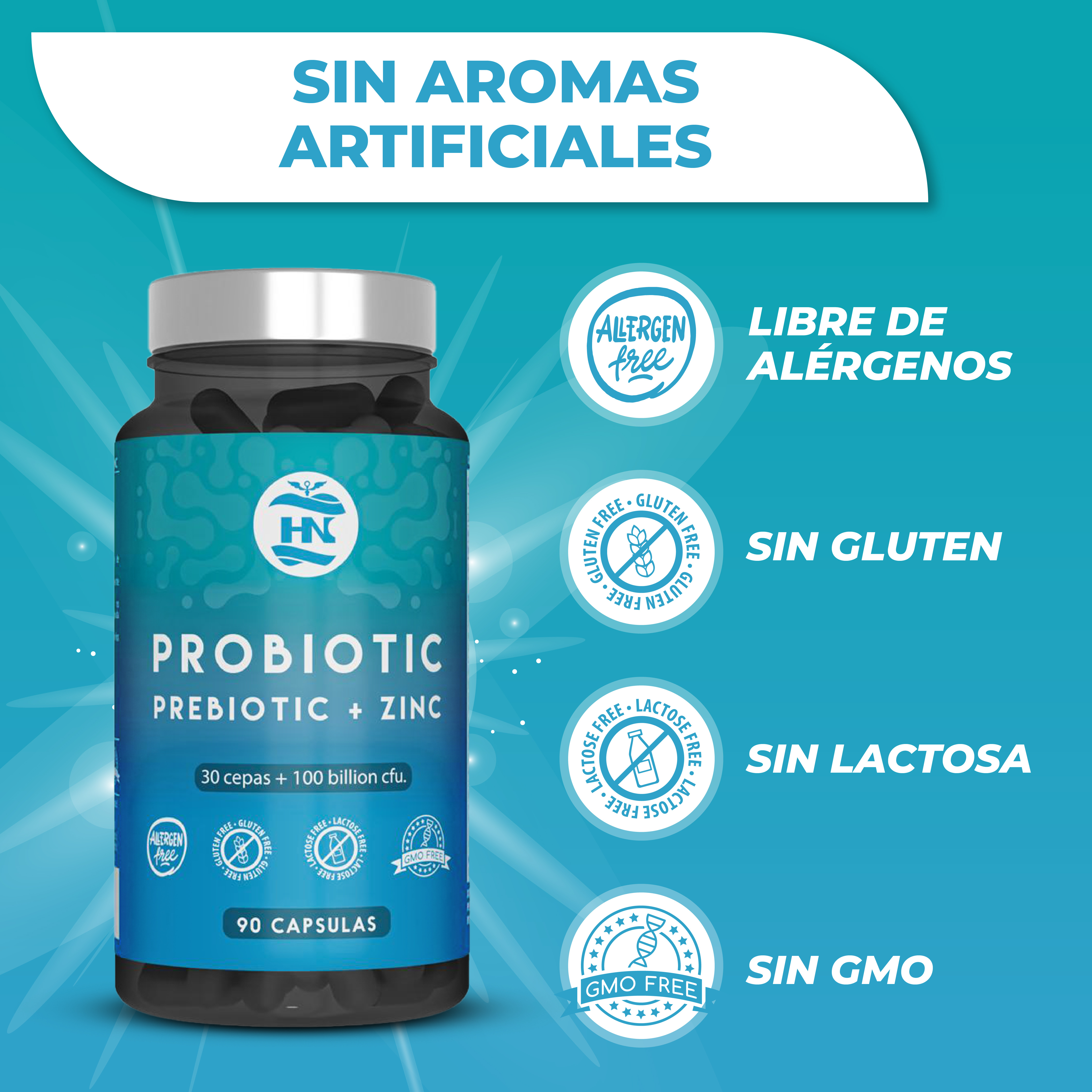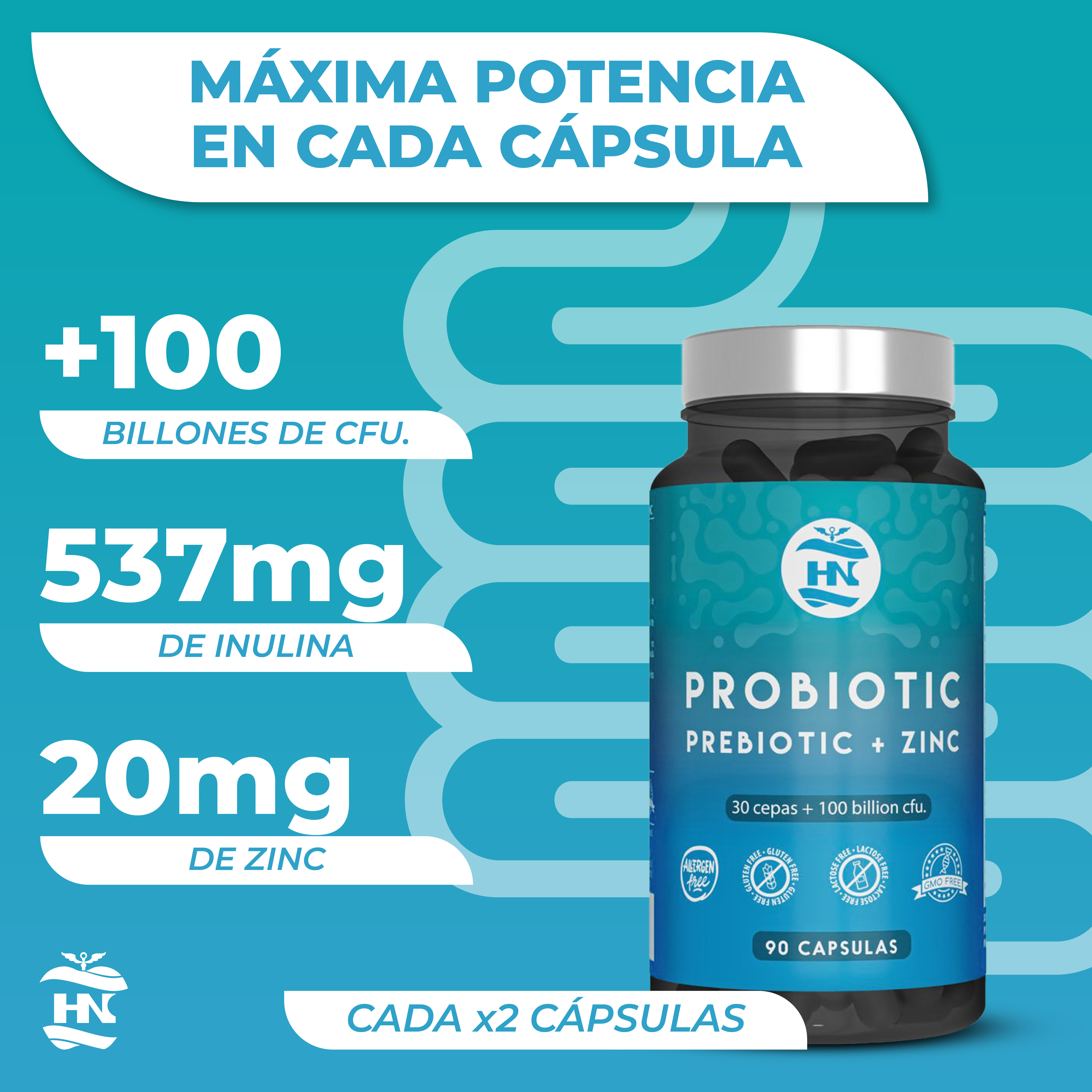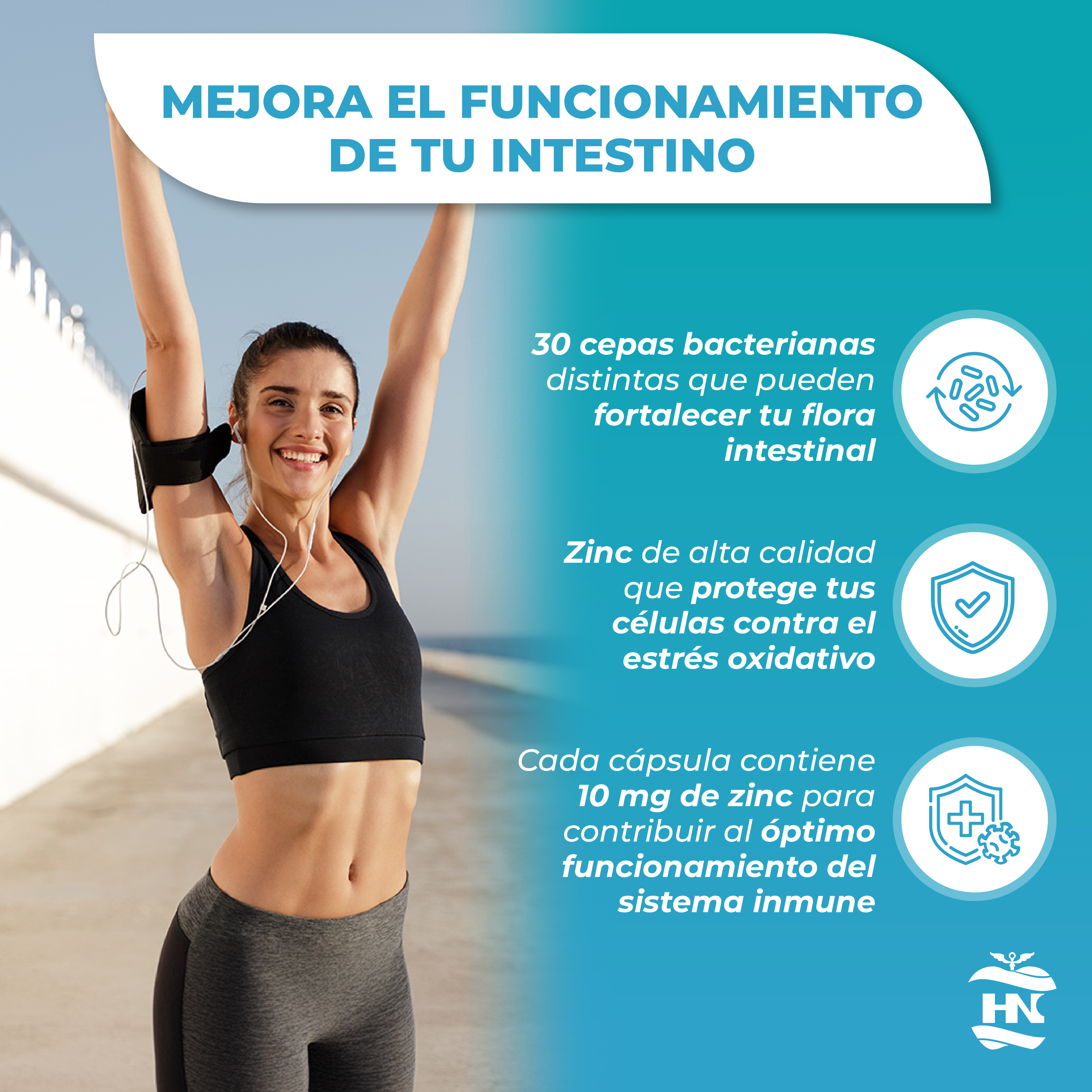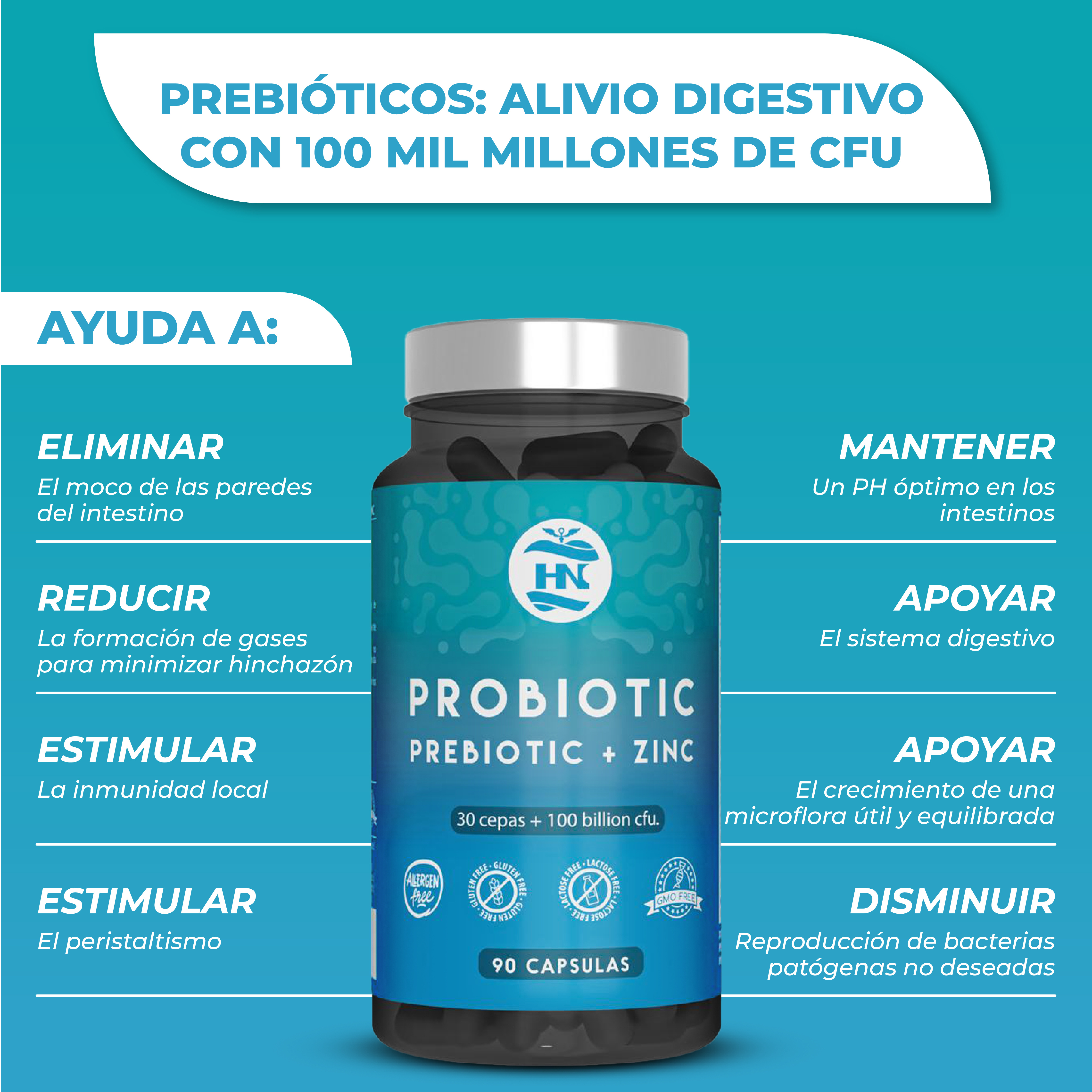 INGREDIENTES: Mezcla probiótica de 30 cepas: Lactobacillus acidophilus, Lactobacillus plantarum, Lactobacillus reuteri, Lactobacillus rhamnosus, Lactobacillus casei, Lactobacillus paracasei, Lactobacillus delbrueckii subsp. bulgaricus, Lactobacillus delbrueckii subsp. lactis, Lactobacillus salivarius, Lactobacillus helveticus, Lactobacillus fermentum, Lactobacillus gasseri, Lactobacillus johnsonii, Lactobacillus crispatus, Streptococcus thermophilus, Bifidobacterium bifidum, Bifidobacterium animalis subsp. lactis (B. lactis), Bifidobacterium longum subsp. longum (B. longum), Bifidobacterium breve, Bifidobacterium adolescentis, Bifidobacterium longum subsp. infantis (B. infantis), Lactococcus lactis subsp. lactis, Saccharomyces Boulardii, Lactobacillus brevis, Bifidobacterium animalis, Lactobacillus amylovorus, Lactobacillus sakei, Leuconostoc mesenteroides. Inulina – Fibra de inulina (1-INULINA), Sulfato de zinc 1 Hidratado, Dióxido de silicio (agente antiaglomerante), Estearato de magnesio vegetal (agente antiaglomerante), Cápsula vegetal 0 de liberación retardada transparente (Hidroxipropilmetilcelulosa y goma de Gellan). Instrucciones Como suplemento dietético, tome dos (2) cápsulas al día, con alimentos o un vaso de agua o según las indicaciones de un médico. No exceda la dosis diaria recomendada.